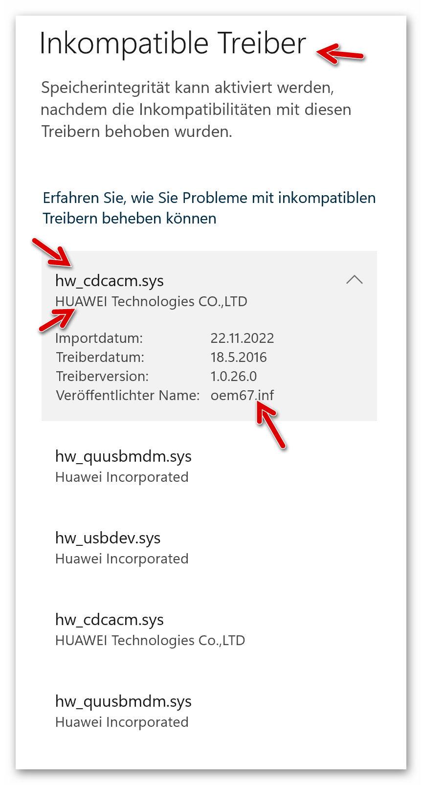 In diesem Beispiel wird gezeigte, wie veraltete Treiber entfernt werden können. Die Dateien stammen von dem Huawei-Tool „HiSuite“, welche bei der Deinstallation des Tools nicht gelöscht wurden. Für andere veraltete Treiber ist die geschilderte Vorgehensweise sinngemäß gleich anzuwenden. Die Meldung wird unter Windows-Sicherheit -> Kernisolierung -> Speicher-Integrität angezeigt: