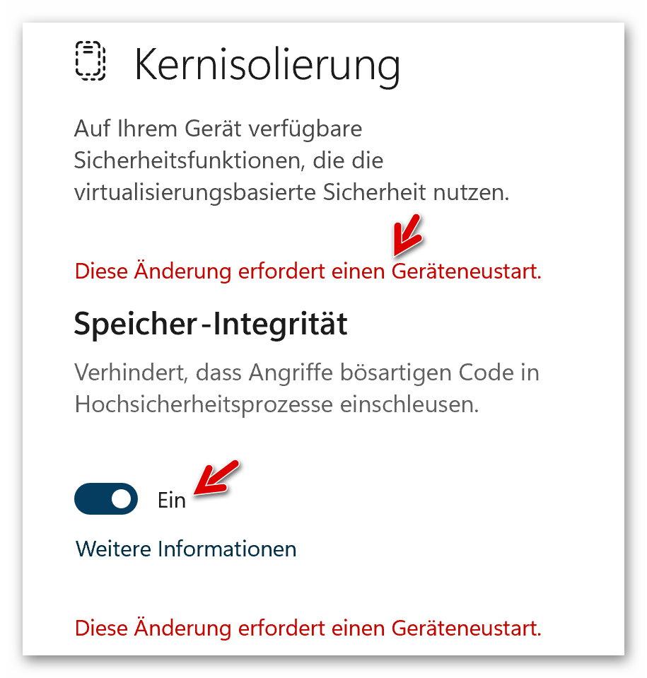 Nun kann der unten gezeigte Schalter ein „Ein“ gestellt werden und nach einem Neustart von Windows wird die Fehlermeldung nicht mehr angezeigt: