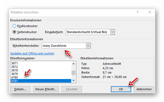Für das Beispiel wird die Zweckform-Etikette Nr. 4781 benutzt; mit OK bestätigen: