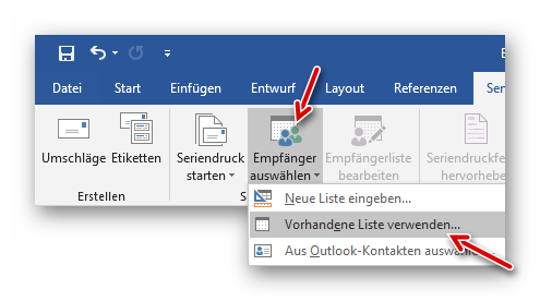 Zum Verknüpfen mit den Empfängeradressen klicken wir auf “Empfänger auswählen” und “Vorhandene Liste verwenden”: