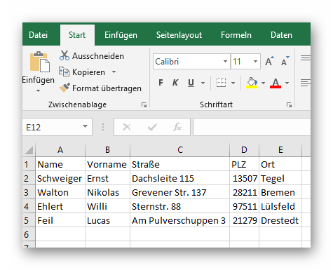 Ansicht der Beispieldatei (keine realen Adressen; erzeugt mit diesem Testdaten Generator). Die erste Zeile enthält die Spaltennamen für die Seriendruck-Funktion: