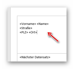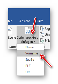 Die Seriendruckfelder werden nun nacheinander in der gewünschten Reihenfolge eingegeben (Leerzeichen soweit erforderlich hinzufügen):