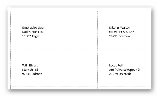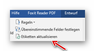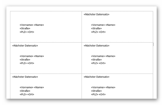 Bei Bedarf kann über dem Adressblock im ersten Etikett die Absenderangabe in kleiner Schrift hinzugefügt werden. Danach muss der gesamte Text aktualisiert und die richtige Position durch einen Probedruck getestet werden.