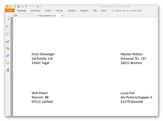 Zur Überprüfung drucken wir lediglich eine Seite aus und vergleichen das Ergebnis mit einem Etikettenblatt. Wenn alles korrekt ist, kann der endgültige Ausdruck gestartet werden: