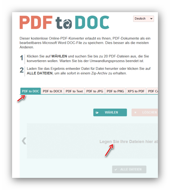 Wir rufen zunächst die Website “https://pdf2doc.com/de/” auf. Die Voreinstellung ist Konvertierung in das DOC-Format (kann nach DOCX geändert werden). Die schnellste Methode zur Konvertierung geht mit Drag & Drop (Ziehen und Fallenlassen) der PDF-Datei auf das gezeigte Feld (Legen Sie Ihre Dateien…):