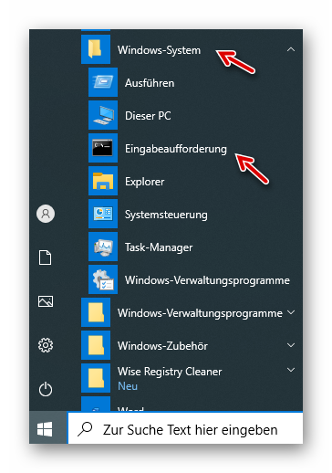 Wir klicken auf das Windows-Logo unten links und dann auf Windows-System -> Eingabeaufforderung: