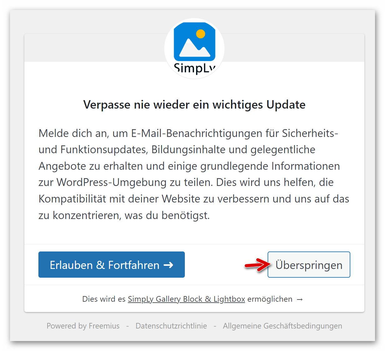 Nach der Installation und Aktivierung des Plugins klicken wir auf „Überspringen“: