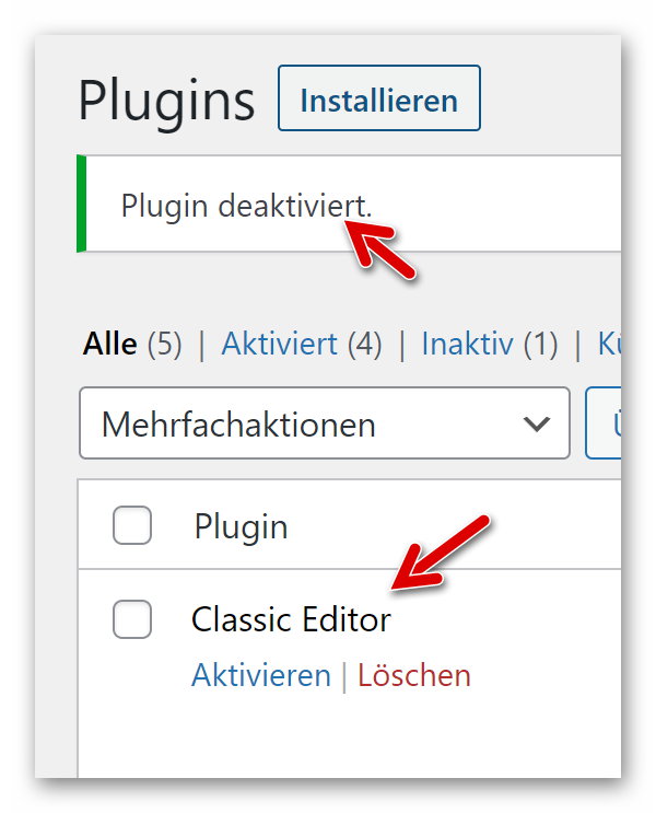 Zur Verwendung von Gutenberg muss vorab das Plugin „Classic Editor“ deaktiviert werden: