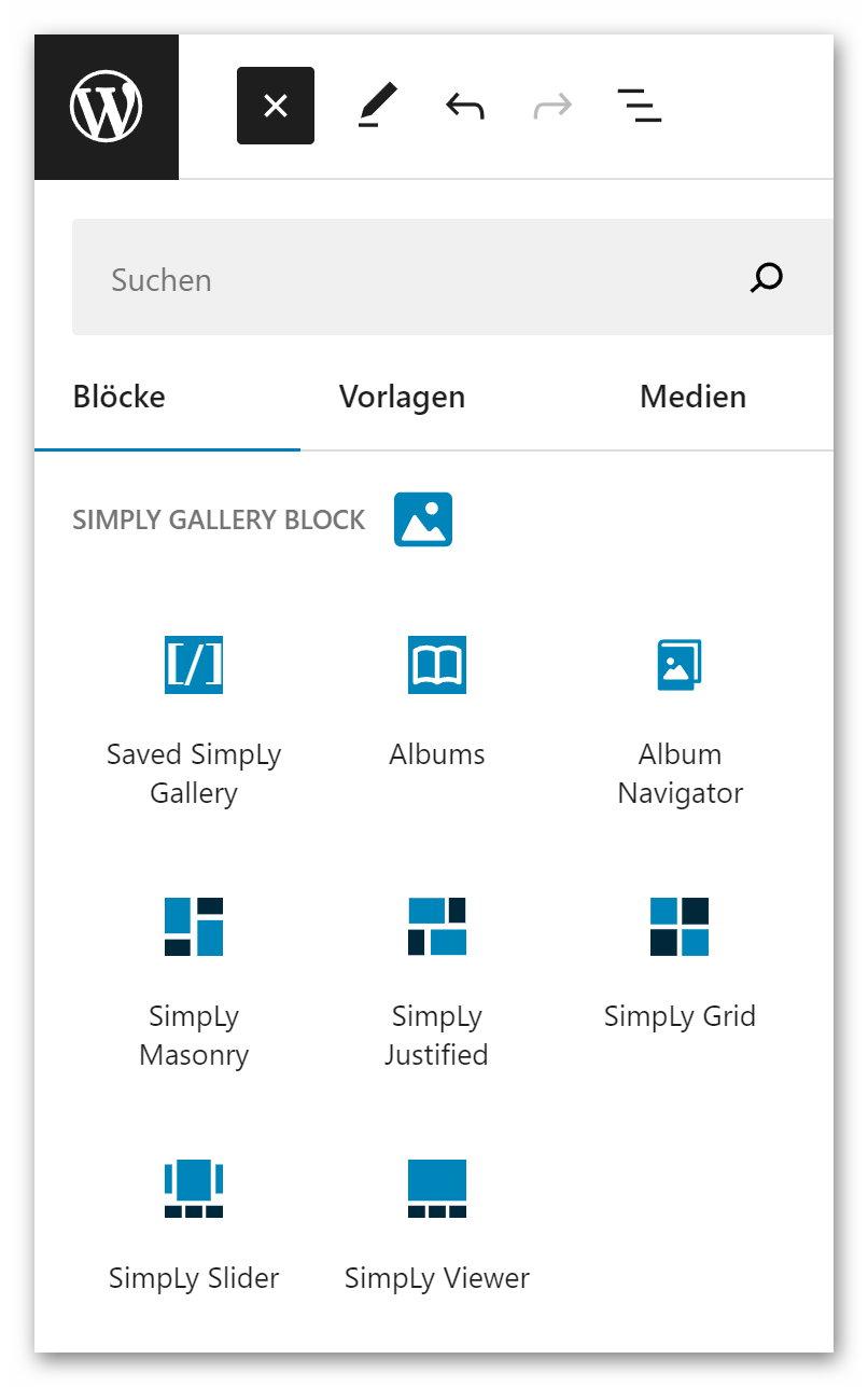 Eine neue Seite wird erstellt. Von „SimpLy Gallery“ stehen zahlreiche Blöcke zur Verfügung: