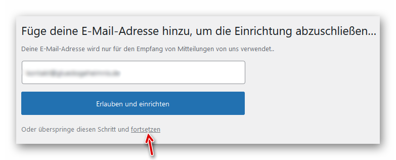 Nach der Installation und Aktivierung wird diese Nachricht angezeigt, mit welcher der Plugin-Entwickler E-Mail-Adressen zur Werbung sammelt. Wir klicken auf den unteren Link “fortsetzen”…