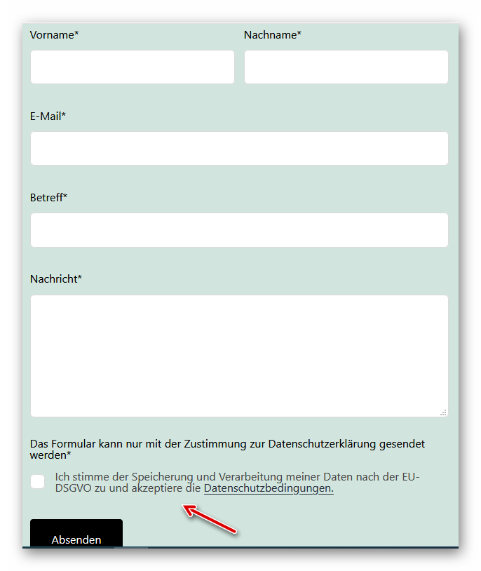 Der Benutzer eines Formulares muss nach der DSGVO seine Zustimmung zur Verarbeitung seiner Daten geben. Die Datenschutzerklärung kann mit einer kleinen Änderung auch verlinkt werden.