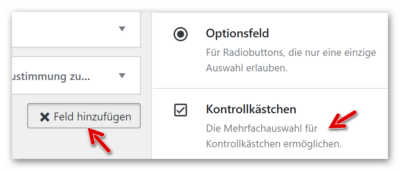 In diesem Beispiel verwenden wir das o. g. Plugin und öffnen die Formulareinstellungen. Wir klicken auf Feld hinzufügen -> Kontrollkästchen: