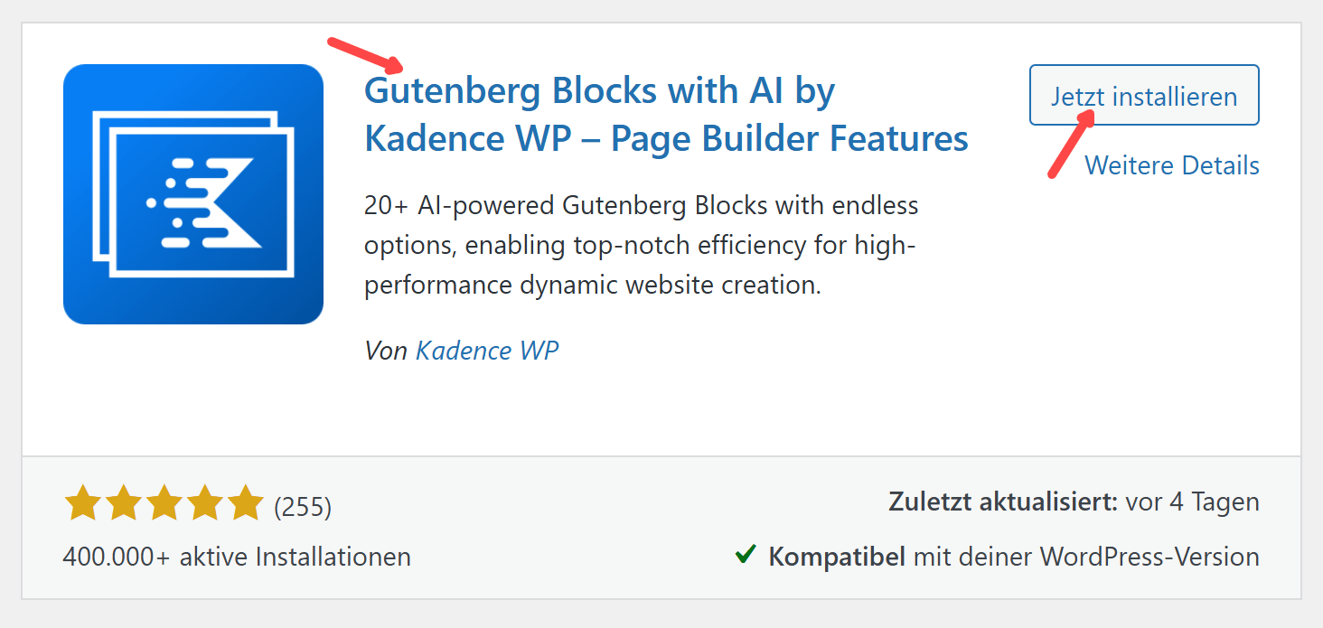 Installation Start WordPress Formulare Kadence Formulare Installation Wir installieren das Plugin im Dashboard über Plugins -> Installieren: