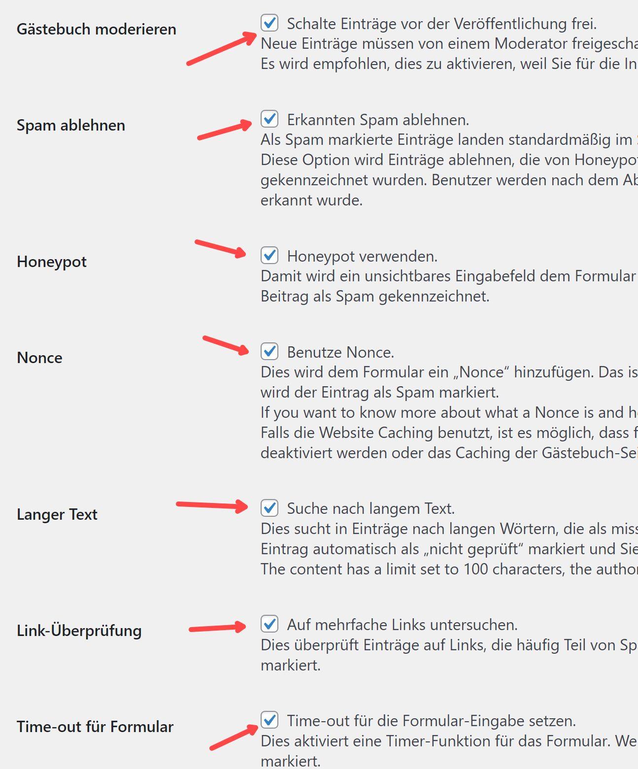 Das erste Häkchen bei „Gästebuch moderieren“ unbedingt setzen, damit Spammer keine unerwünschten oder potenziell gefährliche Einträge im Gästebuch hinterlassen. Der Websitebetreiber ist für daraus entstehende Schäden an den Besucher-PCs usw. voll verantwortlich.