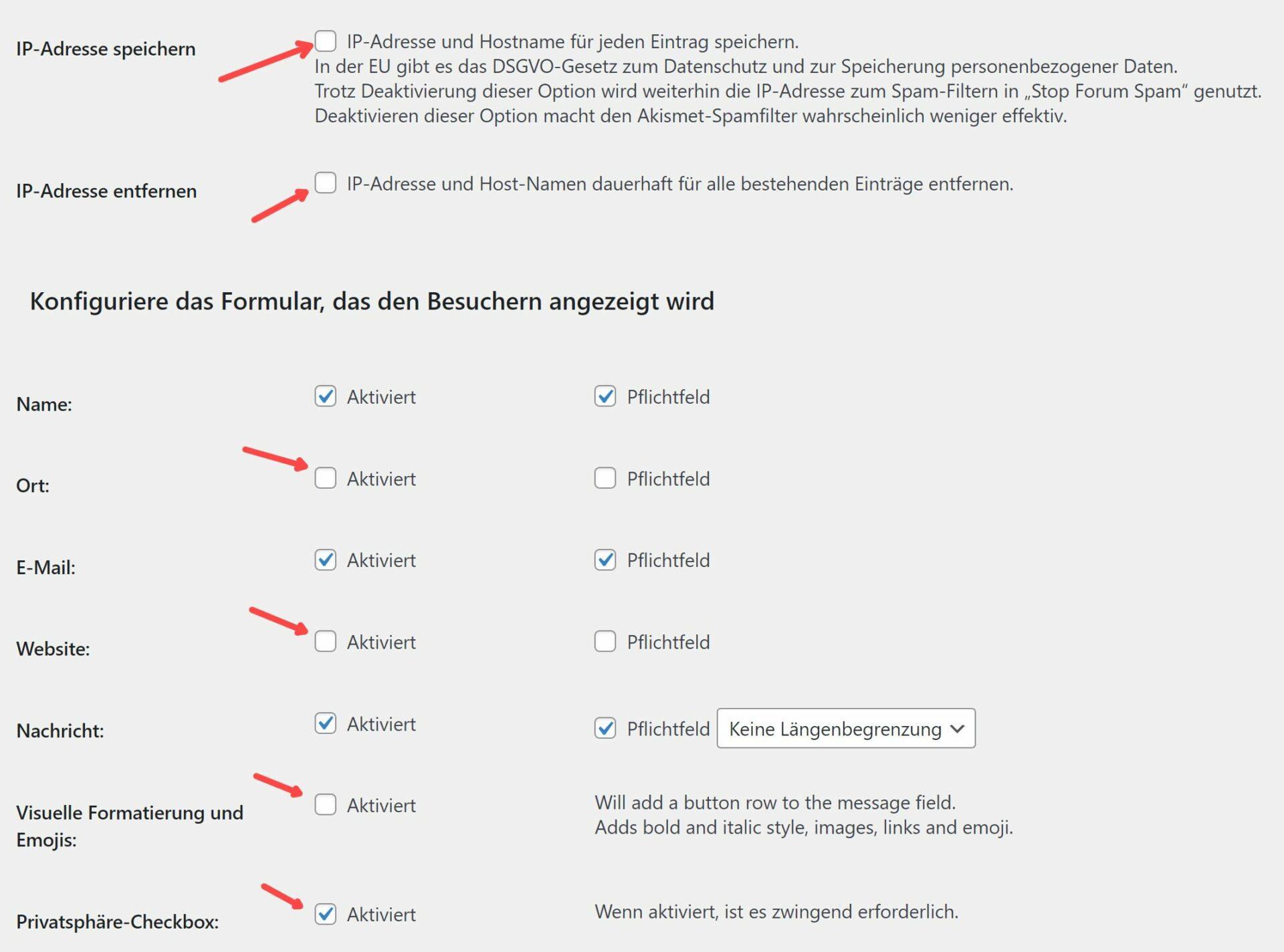 Die Option „Privatsphäre-Checkbox“ ist laut DSGVO zu aktivieren. Die weiteren Anpassungen mit der Übersetzung des englischen Textes sind hier beschrieben.