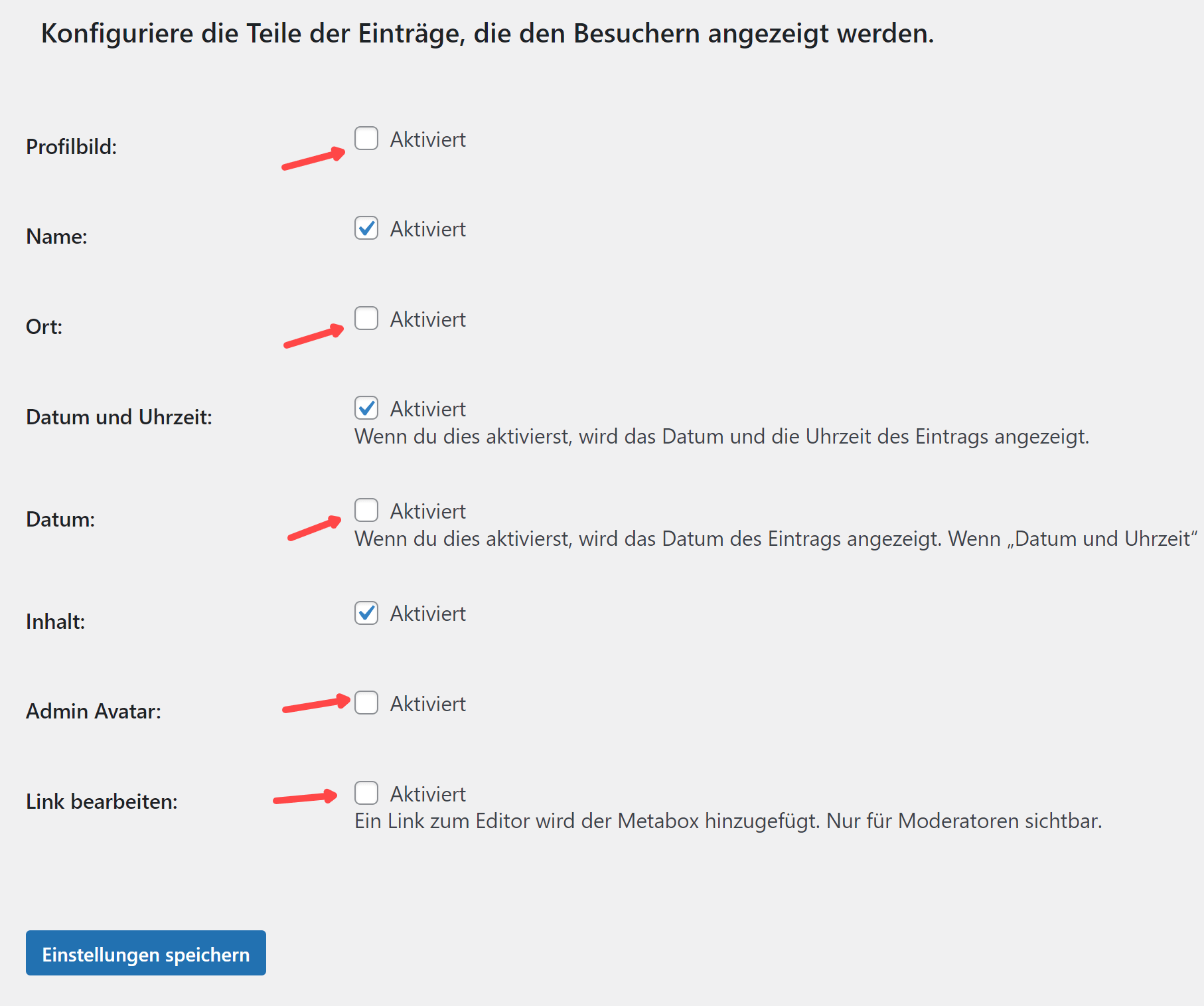Nach der Installation und Aktivierung muss „Gwolle Guestbook“ noch eingerichtet werden. Die empfohlenen Einstellungen sind aus den folgenden Screenshots ersichtlich.