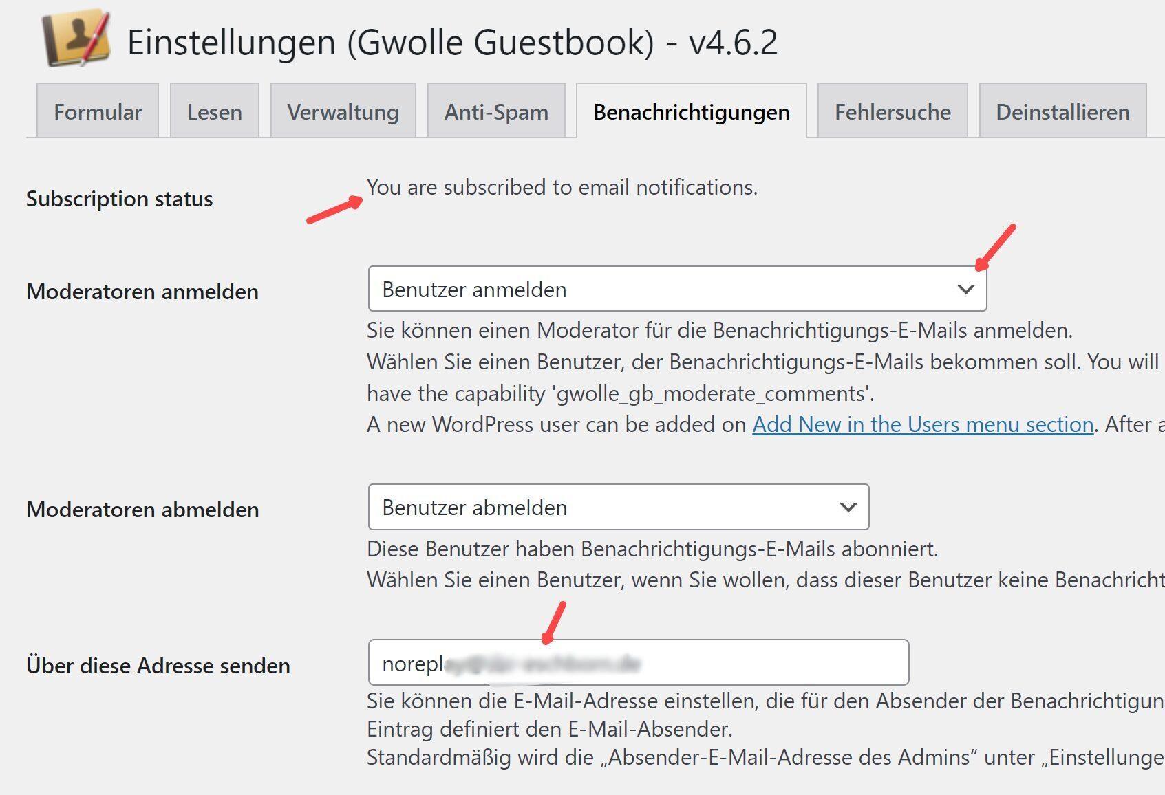 Bei „Moderatoren anmelden“ wird der eingetragene Administrator ausgewählt. Nach dem Abspeichern erscheint in englischer Sprache die Bestätigung: You are subscribed to email notifications.