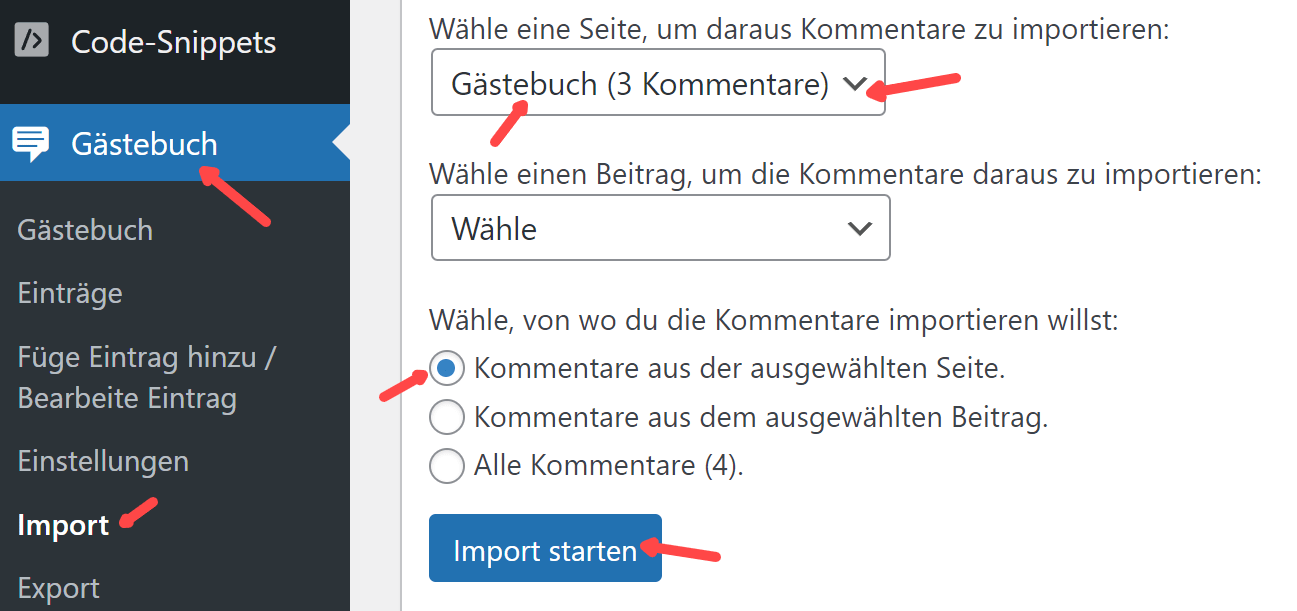 Gästebuch -> Import auswählen und die gezeigten Einstellungen vornehmen. Dann den Import starten: