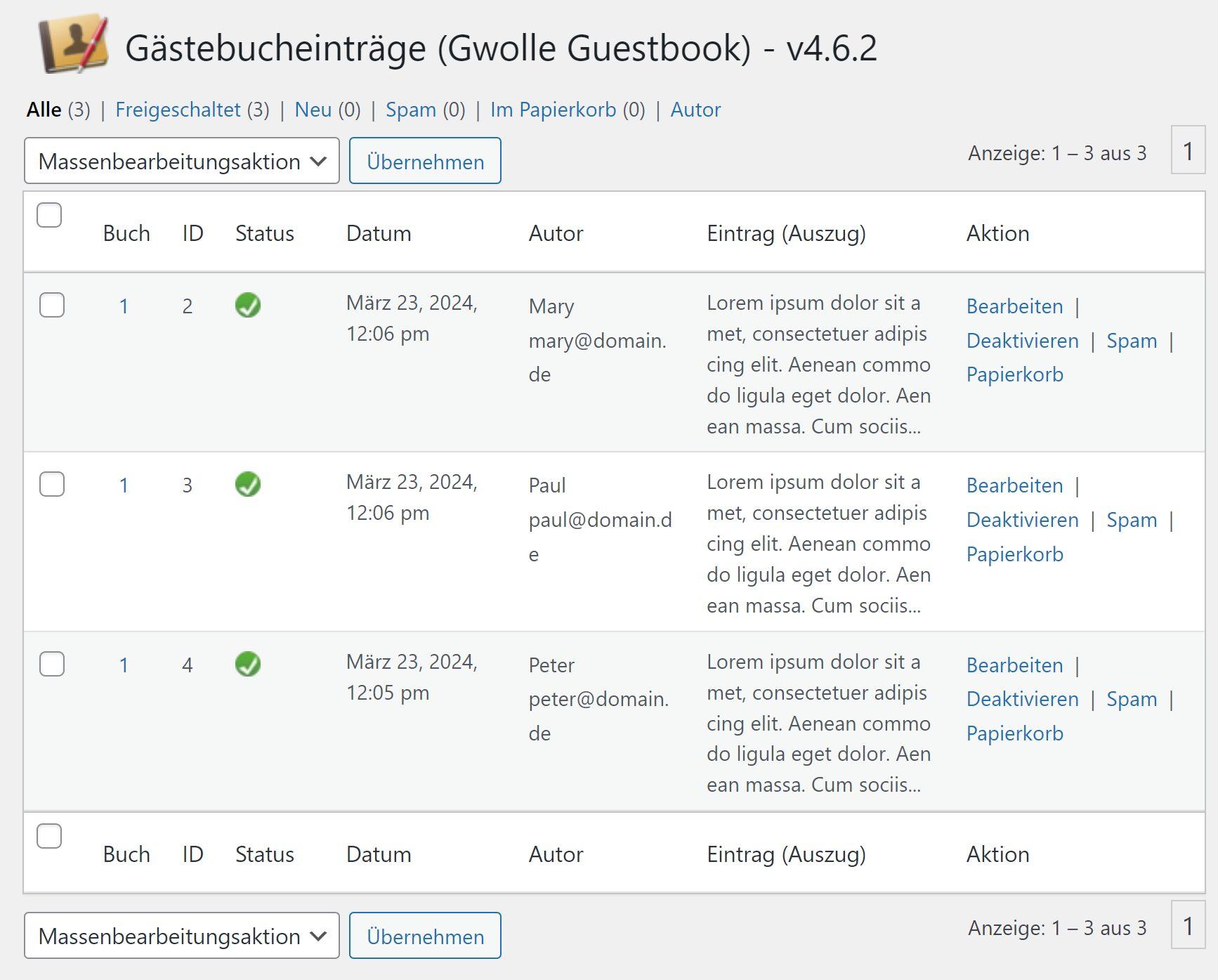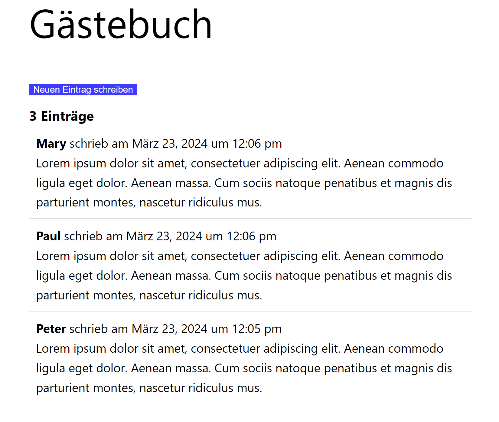 Ein erneuter Aufruf der Gästebuchseite im Frontend zeigt nun korrekt die alten Einträge des Plugins „WP H-Guestbook“ an: