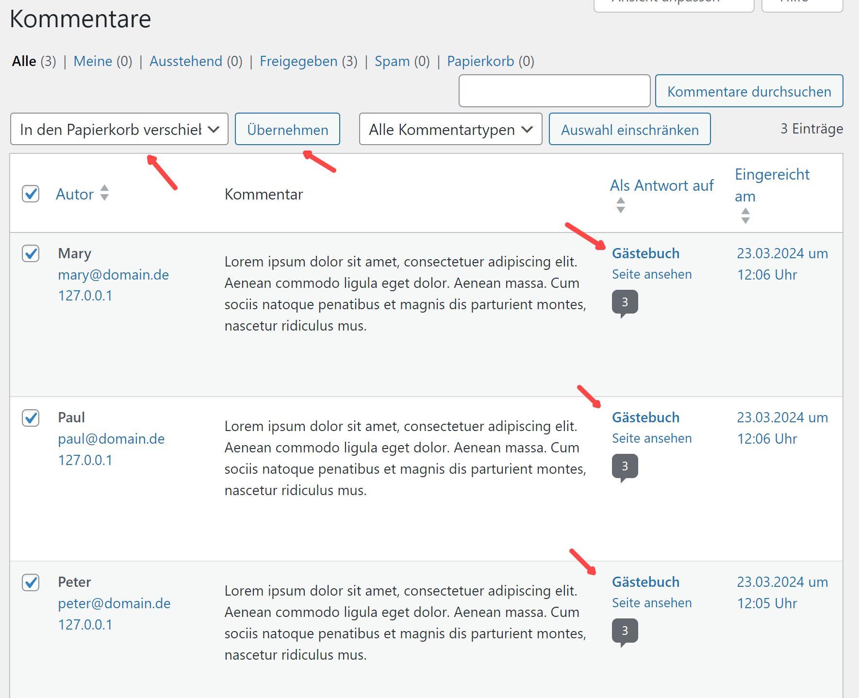 Jetzt müssen alle Kommentar-Einträge der Seite „Gästebuch“ in den Papierkorb verschoben und später gelöscht werden. Dabei ist darauf zu achten, dass nur die Seiten „Gästebuch“ für den Papierkorb markiert werden: