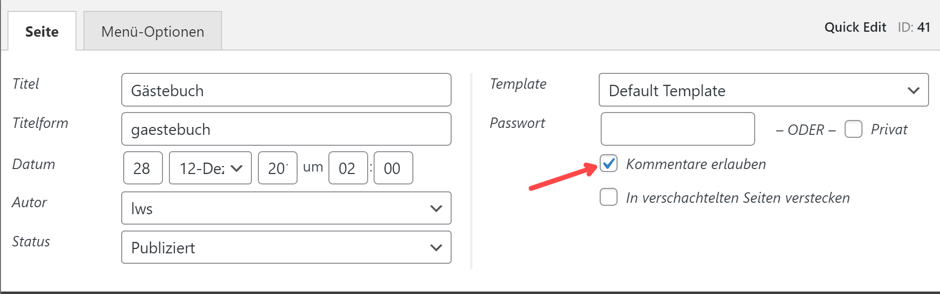 Nun wird die Kommentarfunktion für die Gästebuchseite deaktiviert (Häkchen entfernen):