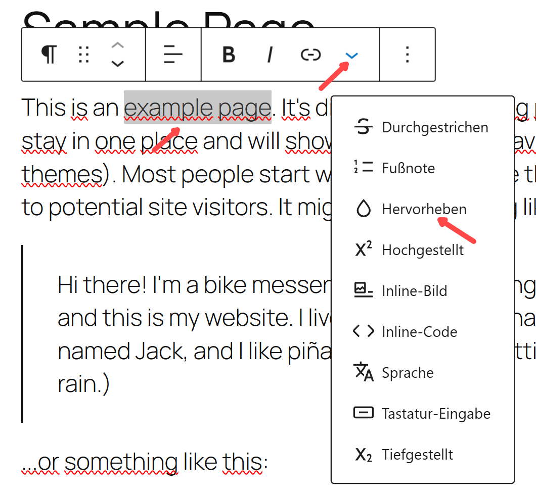 Wir markieren den gewünschten Text, klicken auf den kleinen Pfeil in der Blockleiste und dann auf „Hervorheben“: