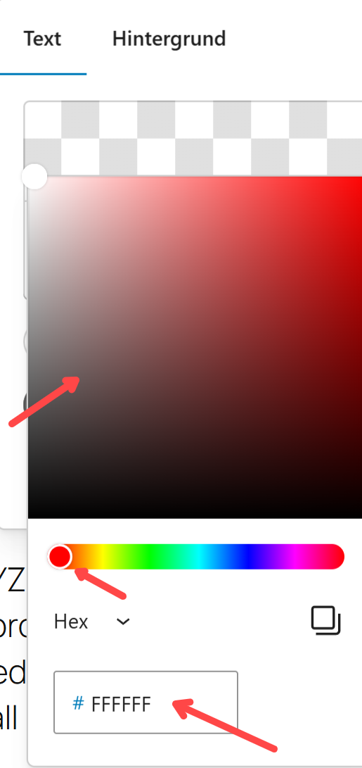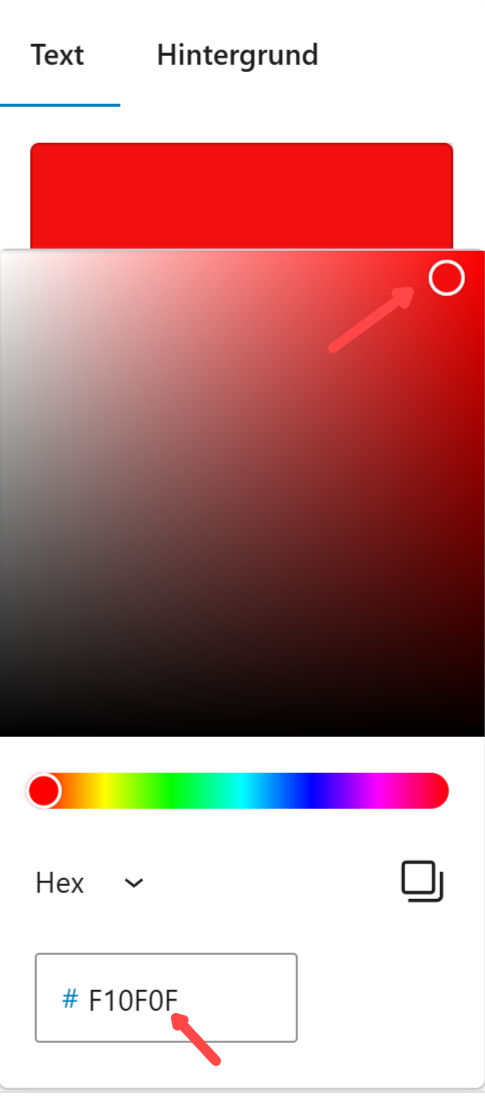 Hier können wir die Farbe frei bestimmen durch Klick in das Farbenfeld, Betätigen des Schiebers oder direkte Eingabe als Hex-Code: