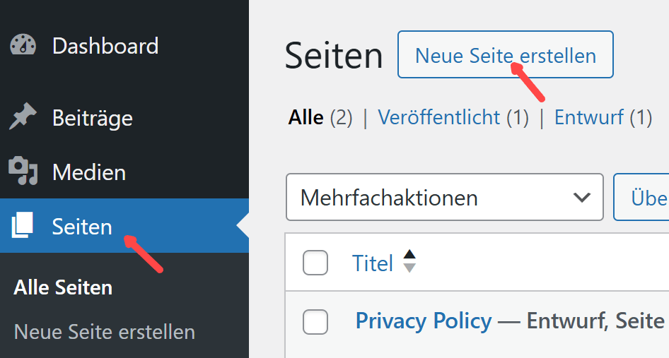 Wir klicken auf Seiten -> Neue Seite erstellen…