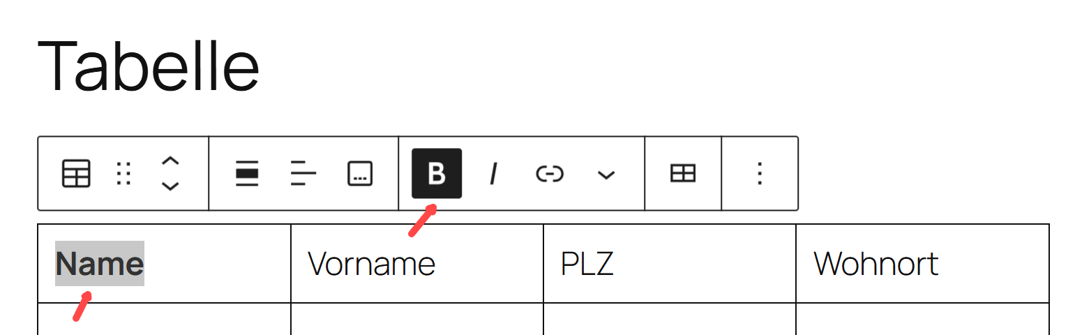 Im Beispiel geben wir Name, Vorname, PLZ und Wohnort als Tabellenüberschrift ein. Danach werden die Angaben markiert und mit Klick auf das „B“ fett ausgezeichnet: