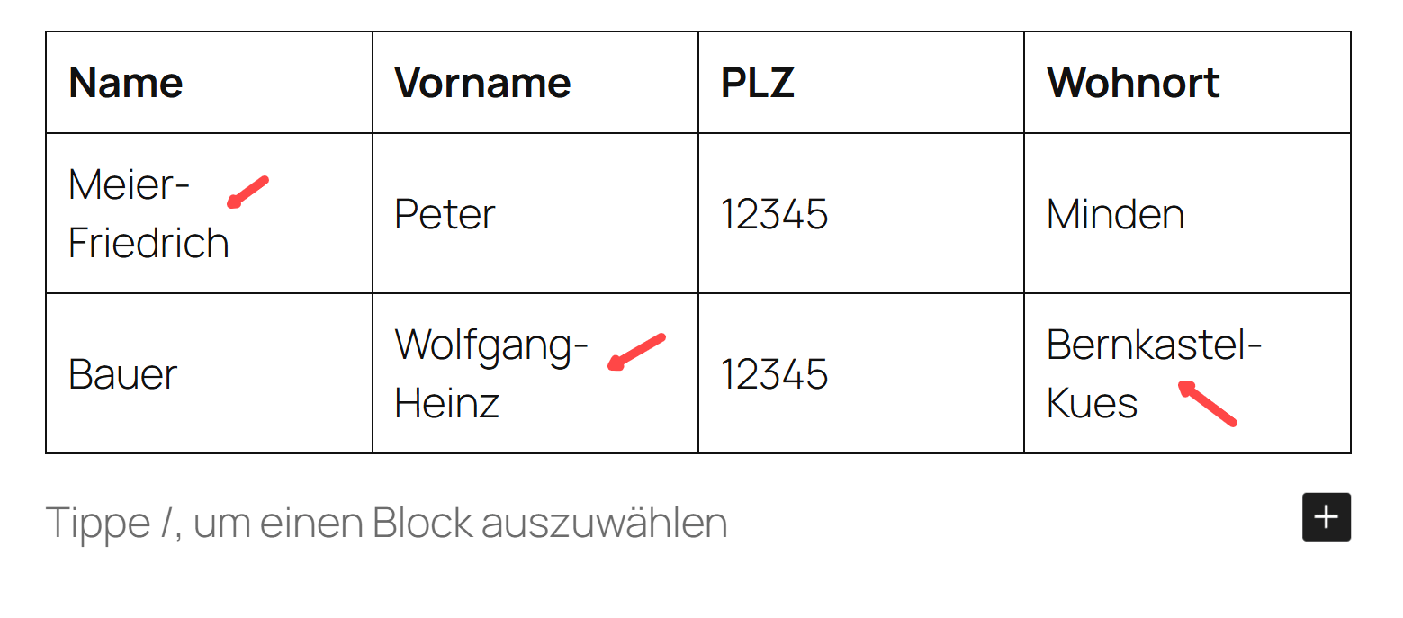 Die Tabelle wird mit Beispieldaten gefüllt, wobei sich durch lange Worte Zeilenumbrüche ergeben: