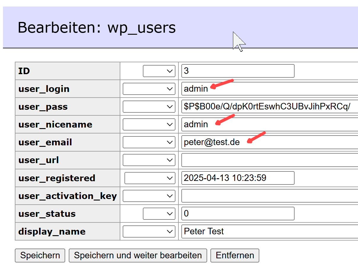 Für die Änderung ist das Plugin „WP Adminer“ erforderlich (herunterladen und aktivieren).