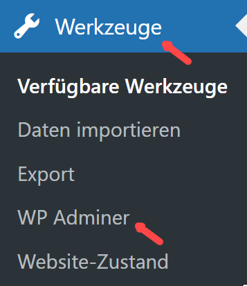 Der Adminer wird über Werkzeuge -> WP Adminer aufgerufen:
