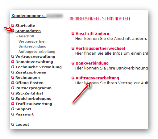 Der Vertrag sollte daher abgeschlossen werden. Dazu loggen wir uns in die “Members Area” ein und klicken auf Stammdaten -> Auftragsverarbeitung: