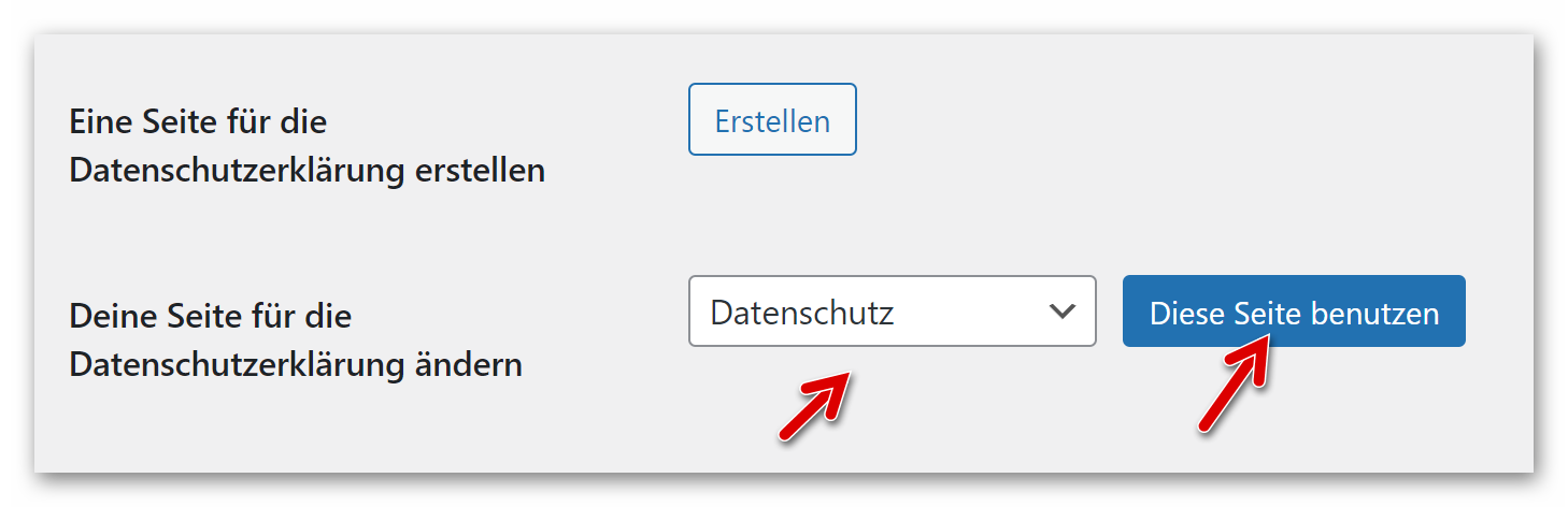Wir klicken links auf Einstellungen -> Datenschutz, wählen eine vorhandene Datenschutzseite (hier mit Namen “Datenschutz”) aus und klicken auf den rechten blauen Button: