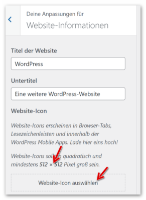 Wir öffnen den Customizer und klicken auf Website-Informationen und danach unten auf „Website-Icon auswählen“: