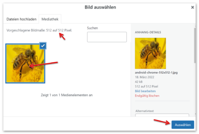 Das zuvor erzeugt (z. B. mit diesem Generator) und in die Mediathek hochgeladene Favicon (512 x 512 Pixel) wird markiert und ausgewählt: