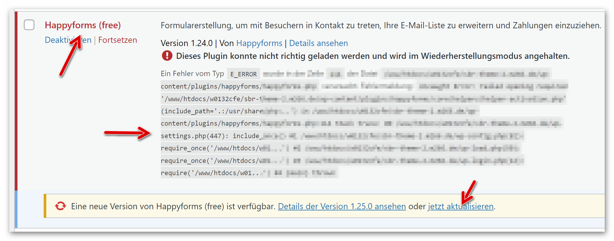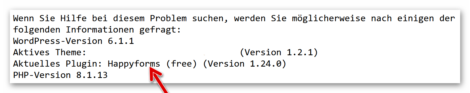 Das fehlerhafte Plugin „Happyforms“ mit weiterer Beschreibung des Fehlers (nur für erfahrene Admins von Bedeutung). Es gibt eine neue Version, auf welche wir mit Klick auf den gezeigten Link aktualisieren:
