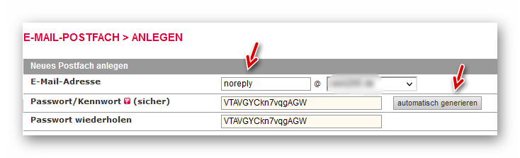 Falls noch nicht geschehen, legen wir in KAS eine neue E-Mail-Adresse, beginnend mit „noreply@…“ an. Das Passwort sollte aus Sicherheitsgründen automatisch generiert werden. Dann speichern wir die Einstellungen zunächst ab: