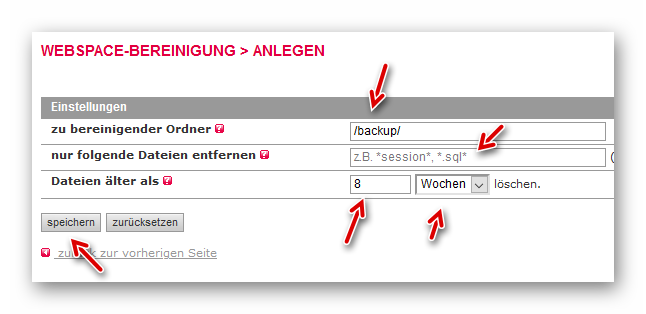 In diesem Formular wählen wir den Pfad zum Ordner, unterscheiden ggf. nach der Dateiendung (.sql, .zip usw.) und wählen den Bereinigungsintervall aus. Nach dem Speichern werden die jeweiligen Dateien im festgelegten Ordner automatisch gelöscht: