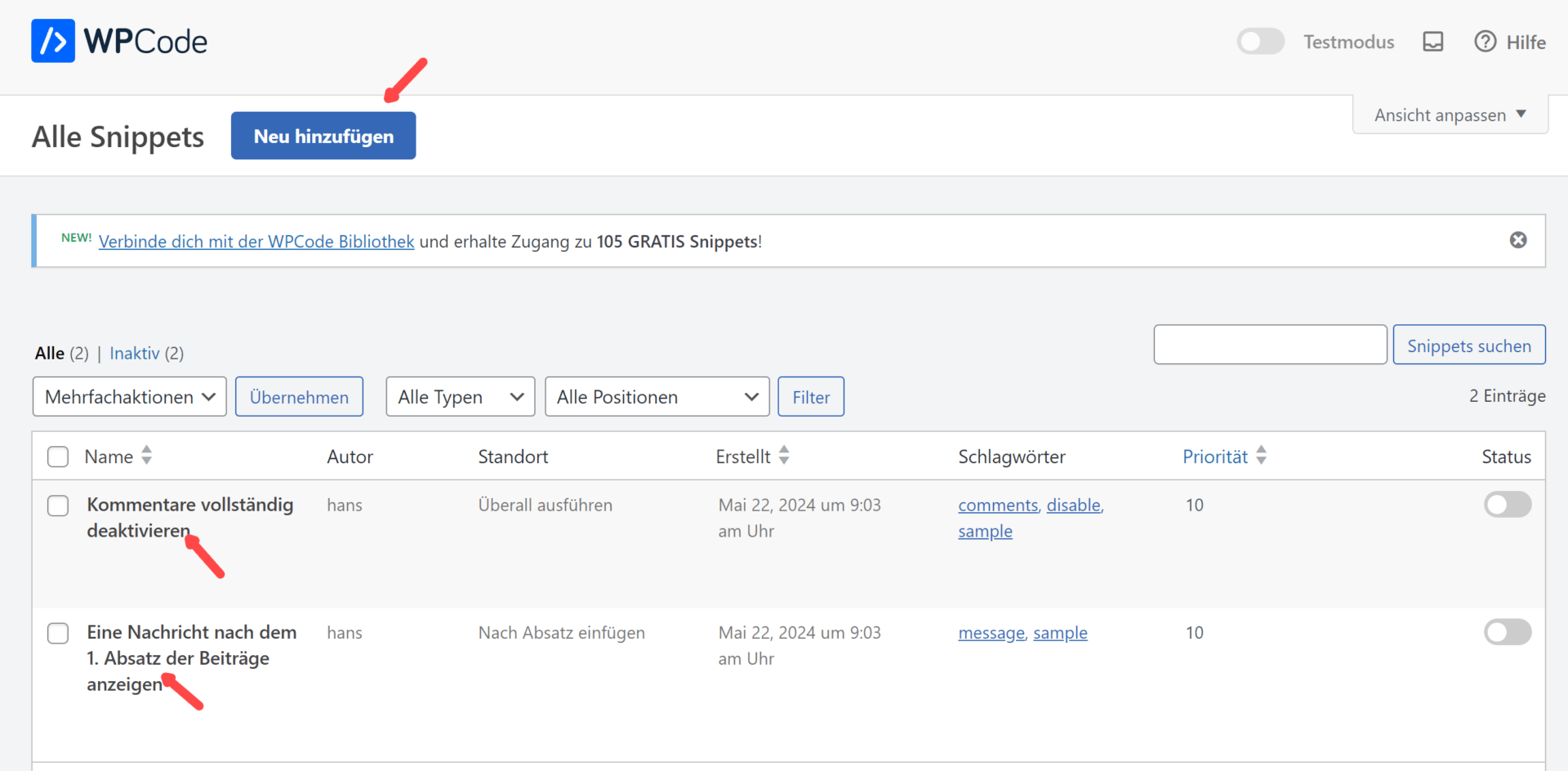 Nach der Installation des Plugins „WPCode“ sind zwei Beispiel-Snippets zu sehen, die gelöscht werden können. Wir klicken auf den Button „Neu hinzufügen“…