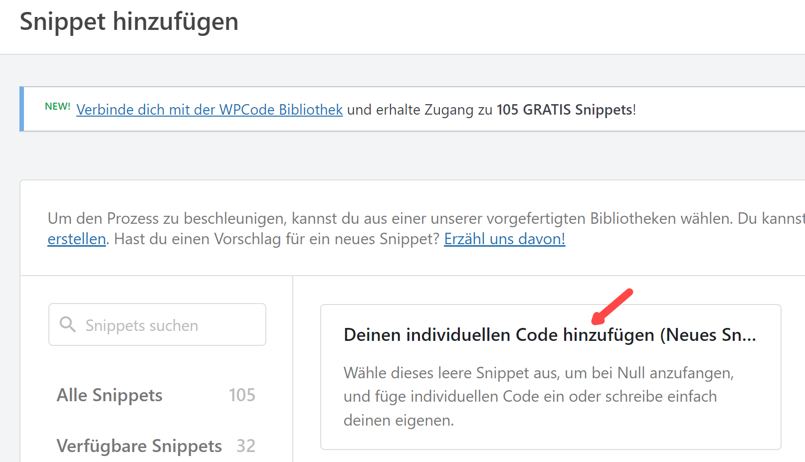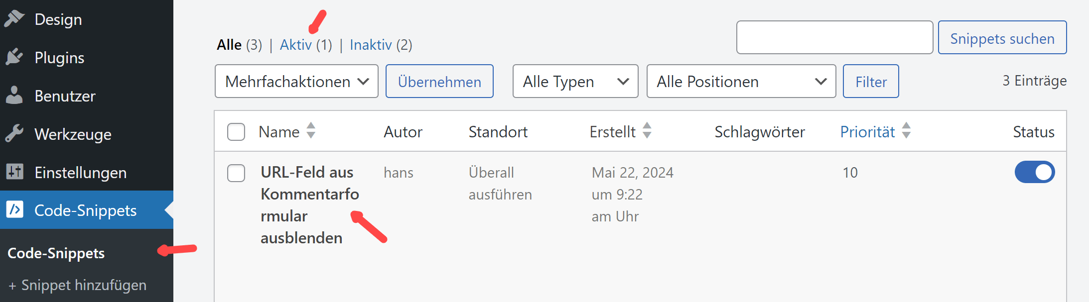 Unter dem Menüpunkt „Code-Snippets“ wird das neu eingefügte Snippets angezeigt:
