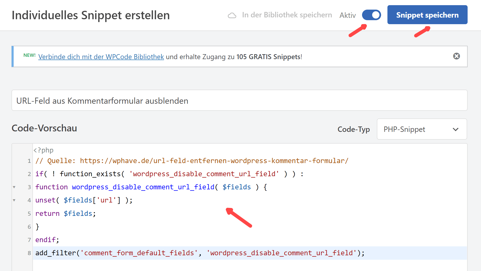 In das große Feld „Code-Vorschau“ kopieren wir den (Beispiel) Code hinein, stellen oben rechts den Schalter auf „Aktiv“ und klicken auf „Snippet speichern“: