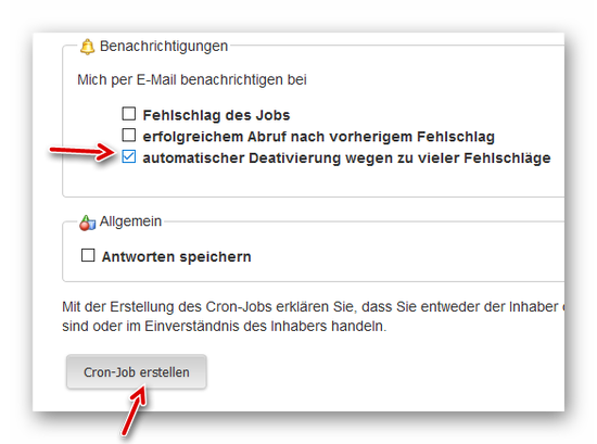 Wir belassen die Einstellungen zur Benachrichtigung und erstellen nun mit Klick auf den Button am Ende des Formulares unseren neuen Cronjob: