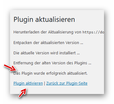 Das Plugin-Downgrade (Rollback zu einer Vorgänger-Version) war erfolgreich. Nun muss noch das Plugin wieder aktiviert werden: