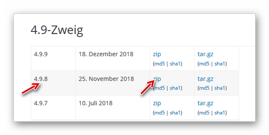 Zunächst laden wir die zuvor benutzte Version von WordPress (z. B. 4.9.8 -> Bitte anpassen) über diesen Link herunter: