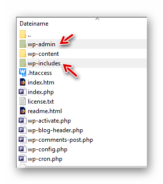 Mit einem FTP-Client (Z. B. FileZilla) loggen wir uns auf dem Server ein und löschen die beiden Ordner “wp-admin” und “wp-includes”: