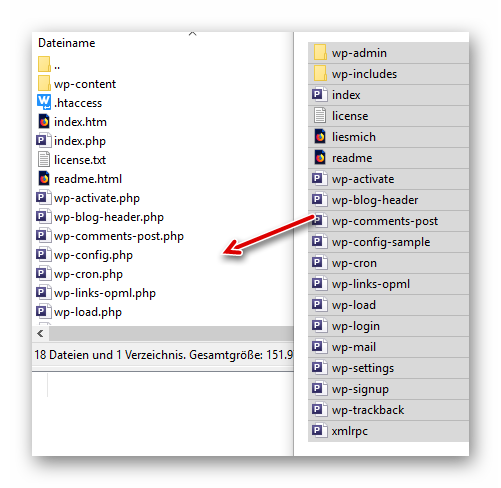 Nun wird der Inhalt der heruntergeladenen früheren Version von WordPress in das WordPress-Root auf dem Server hochgeladen. Die einfachste Methode ist “Drag & Drop”, also alle Quelldateien markieren und in das Fenster von FileZilla hineinziehen: