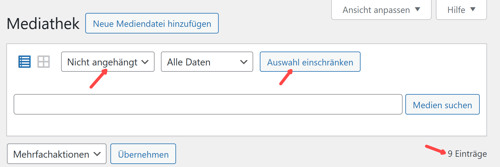 Wir wählen „Nicht angehängt“ aus, um nicht verknüpfte Medien zu finden. Im Beispiel sind es 9 Medien: