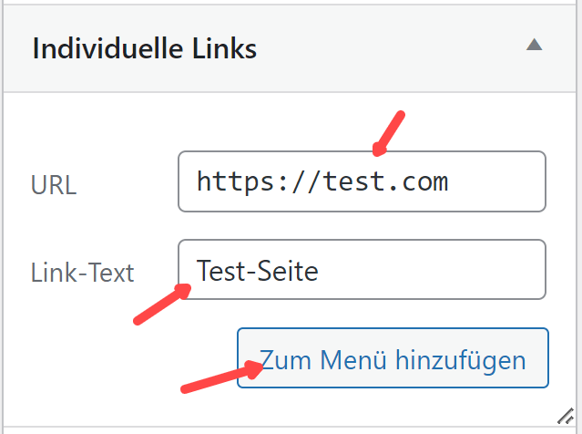 Unter „Individuelle Links“ geben wir die URL und den Namen für den Navigations-Button ein. Dann den unteren Button anklicken: