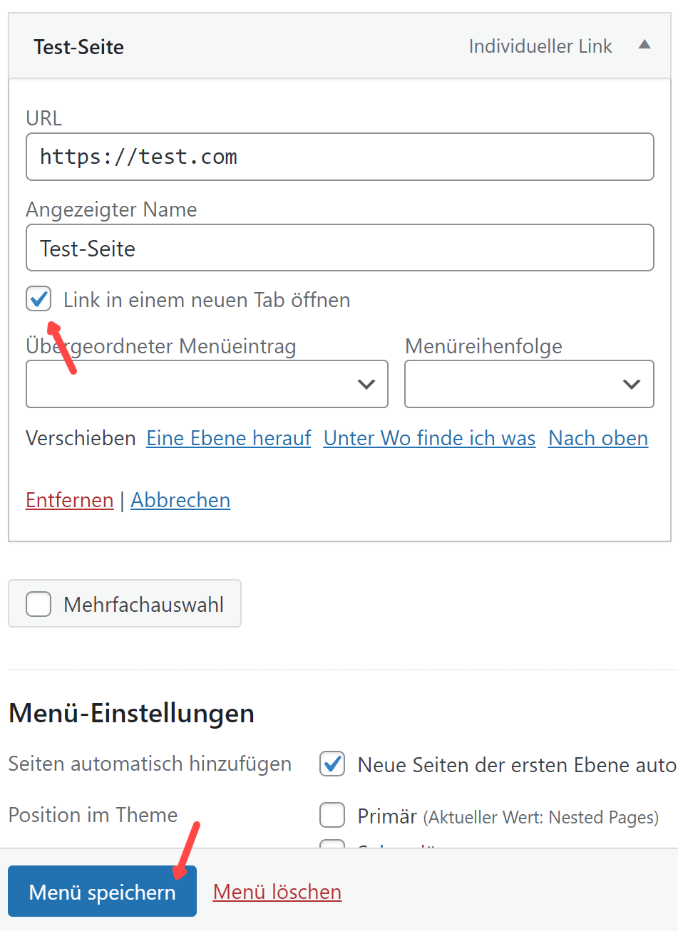 Im Menü (Navigation) setzen wir das markierte Häkchen und speichern die Änderung ab: